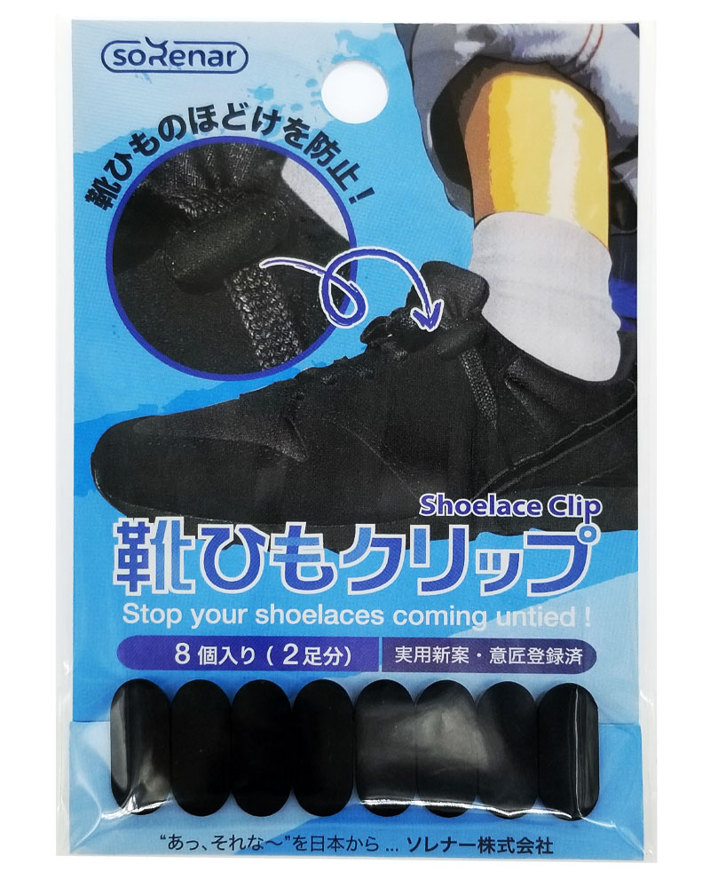 "Shoelace clip" prevents unwinding of shoelaces by blocking the "force that unties shoelaces" generated at the tip of shoelaces when walking.